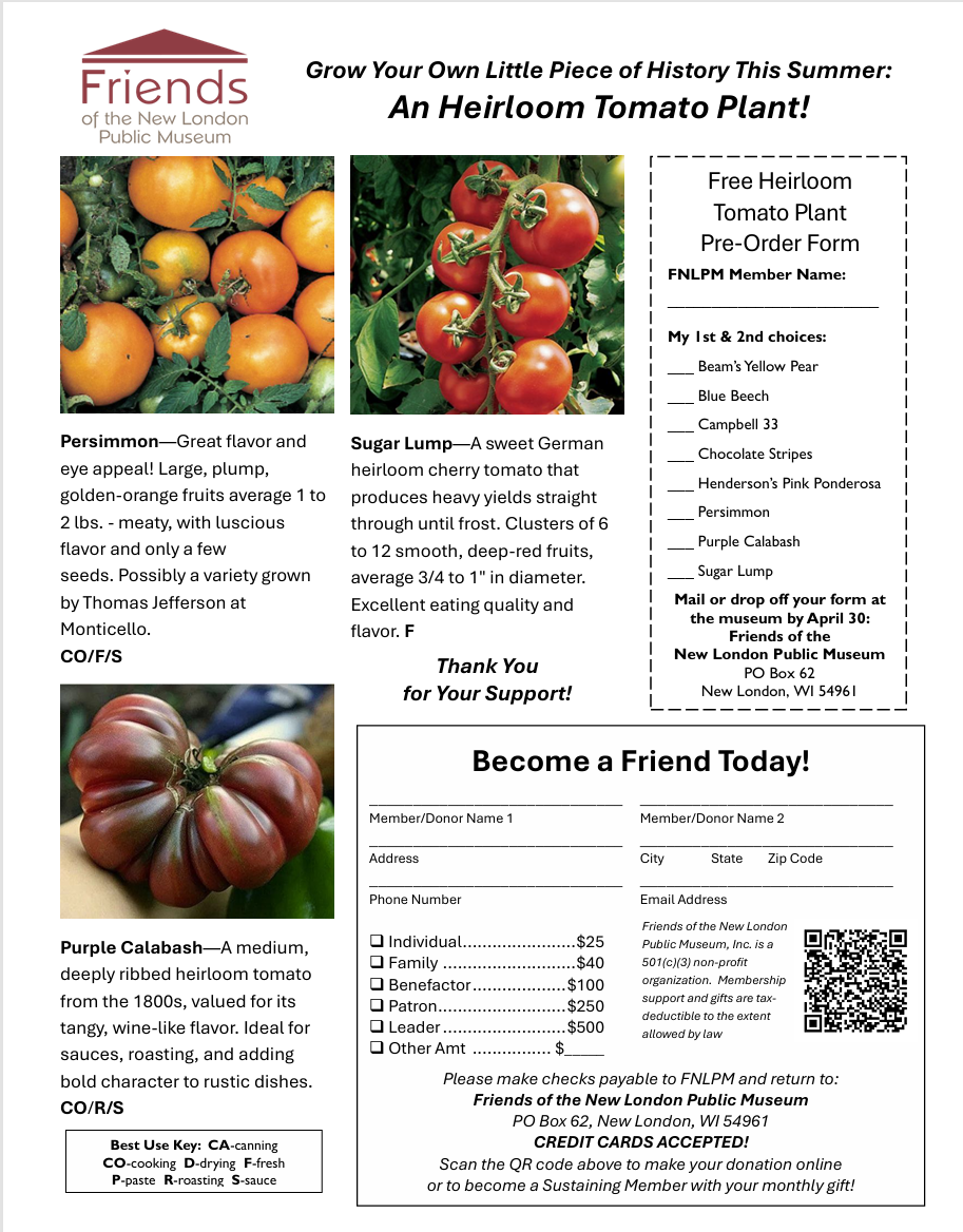 Spring is almost here and so are the tomatoes! Become a Friend of the New London Public Museum and receive a free heirloom tomato plant as our thank-you for supporting local history. Even better? Join at the Sustainer level and provide steady, year-round support that helps keep the museum thriving. Members receive one free plant (reserve by April 30), and everyone can purchase additional heirloom varieties while supplies last. It’s a meaningful way to grow your garden and invest in your community. Sign up, dig in, and help history grow!